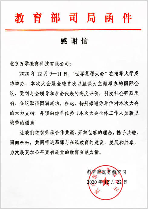 万学由于在配合教育部世界慕课大会的工作中做出了重要贡献,获得教育部重磅感谢信。